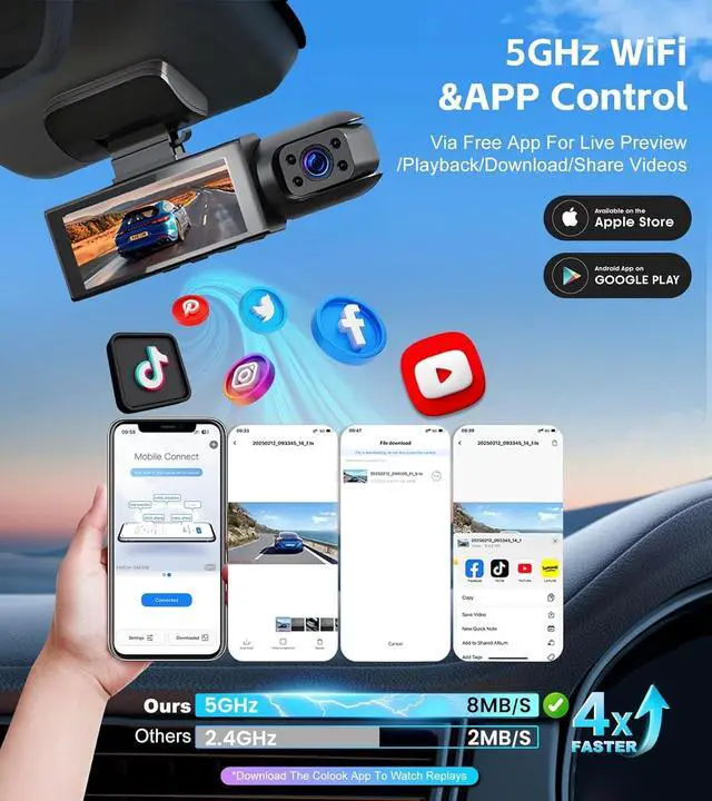 Faster 5GHz WiFi Connection & APP Control-wireless dash cam front and rear is equipped with 5GHz Wi-Fi connectivity module to provide faster Wi-Fi data transfer for smooth video preview, download and sharing. You can easily access recorded videos, watch live streams, set up your dash camera, download and share your videos to social media directly from your smartphone via APP. And you can share your traveling scenery and beautiful moments with your friends and family.