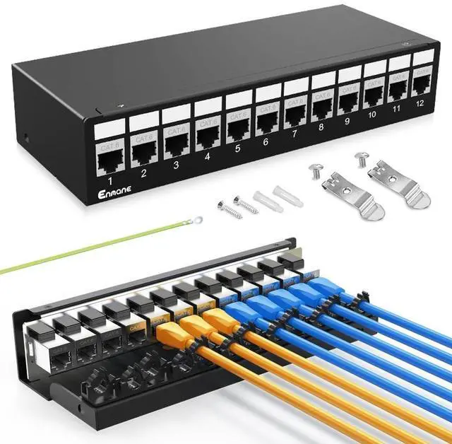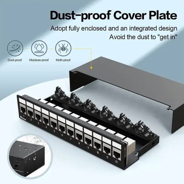Neat and Aesthetic Dust-Proof Design This 12 port patch panel comes with a dust cover, keeping internal wiring organized and preventing dust buildup, which helps extend the lifespan of your equipment. Ideal for home and office use. ^^ Easy Operation, Time and Effort Saving The cat6 keystone patch panel 12 port featuring a ratchet lock design, it eliminates the need for traditional cable ties, simplifying installation and reducing setup time. Perfect for beginners. ^^ Cat6 Shielded Keystone Couplers Pre-installed couplers eliminate the need for punching down cables, allowing for easy plug-and-play installation and saving you time and effort.