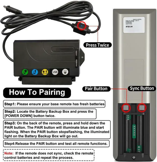 Please Set Before Use. Step 1) Please ensure your base remote has fresh batteries. Step 2) Locate the Battery Backup Box and press the [POWER DOWN] button twice. A light on the Battery Backup Box will illuminate. Step 3) On the back of the remote, press and hold down the PAIR button. The PAIR button will illuminate blue and start flashing. When the PAIR button stops flashing, the illuminated light on the Battery Backup Box will go out. Step 4) Release the PAIR button and test all remote functions.