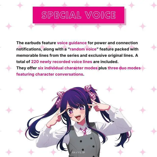 AVIOTs collaboration earbuds are special-edition models packed with the charm of anime, VTubers, and voice actors. Not only do they feature exclusive collaboration designs and packaging, but they also include all-new voice guidance recordings by the original cast or talentsused for actions such as powering on/off and battery alerts. Your favorite characters or performers will assist you with voice prompts! ^^ Whats more, they come with a Random Voice feature, allowing you to enjoy iconic lines or exclusive phrases only available through the earbuds. Simply touch and hold the right earbud to hear surprise voice clips at any time.