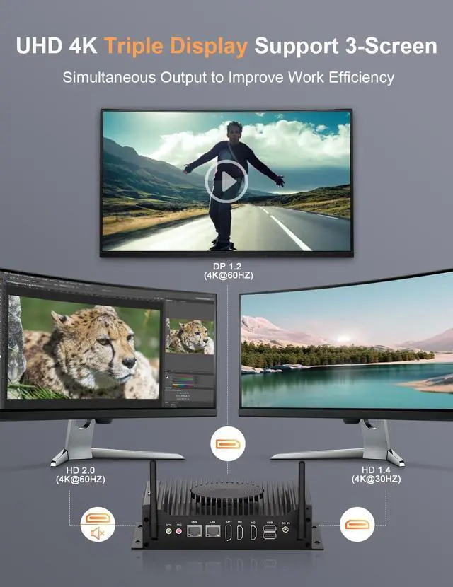 You can also add a 2.5 -inch SSD/HDD (not included) to expand the storage space. The large capacity can shorten the loading time of your entire application and program catalogue, reduce idle time waiting, and increase the mini computer working time. ^^ 4K UHD Triple Display and Wireless ConnectivityThe mini computer is equipped with UHD Graphics 620, which speeds up image processing. It Supports 4K UHD triple display, can handle multiple tasks simultaneously, and optimizes your work efficiency. The industrial mini pc has built-in 2.4G / 5.0G dual-band WiFi5, which can provide a stable network.