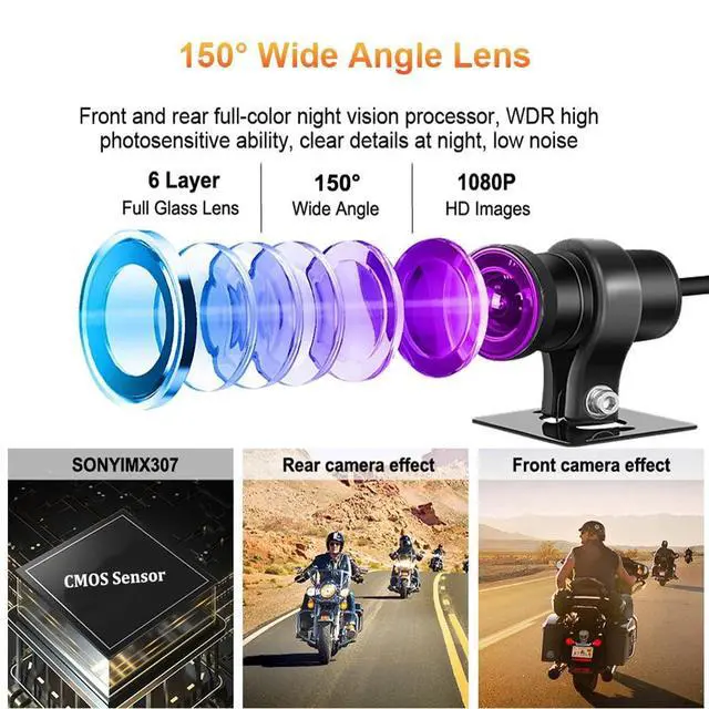 GPS Tracker: With SONYIMX307 COMS sensor, 150 wide angle lens, front and rear both 1080P resolution. Advanced "WDR" technology can automatically capture more lights, adjust the brightness to take clear, color-accurate video even in low-light environments. You will get beautiful robust clearer image. The rider can know the driving speed, longitude and latitude of the recorded video through GPS. The driving track of recorded video can be viewed on the mobile APP and computer ^^