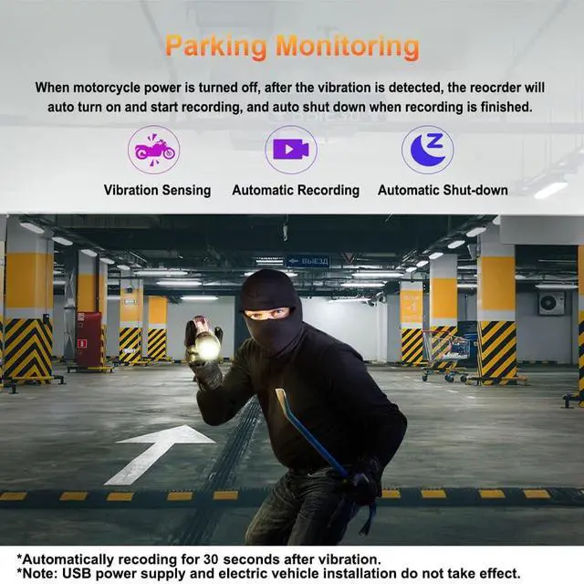 Parking Monitoring: When someone knocks down or moves your motorcycle, the recorder detects that it has been shaken, it will automatically turn on and record for 30 seconds, and then turn off automatically. You can turn this function on and off on the APP Settings page as needed.