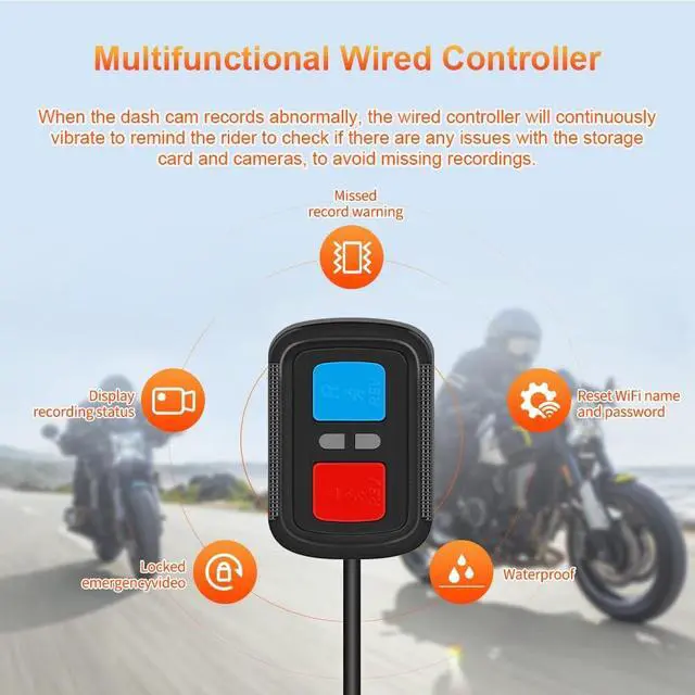 Multifunctional Wired Controller: After you insert the memory card and connect the cameras, if the remote control appears abnormal vibration, indicating that the recorder may be faulty. You can stop the motor vibration by long pressing the blue button. Short press the red button to record the emergency video; long press it to reset the WiFi password. The LED indicator can indicate the working status of the recorder ^^