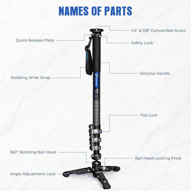Lightweight Carbon Fiber Monopod: Leofoto carbon fiber camera monopod with 32mm max tube, weighs 2.65 lbs/ 1.2 kg and load up to 13.23 lbs/ 6kg. With 3-in-1 functionality, it can be used as a fixed video monopod, trekking pole, or low angle camera tripod, offering versatility for various shooting needsFlexible 3-In-1 Monopod with