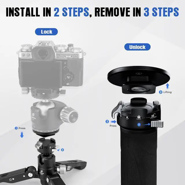 Lock/Release Head: Enjoy the convenience of our innovative quick-release system featured on both the monopod top and tripod base. With just a simple press, you can easily switch between different devices and secure your equipment in place within secondsQuick