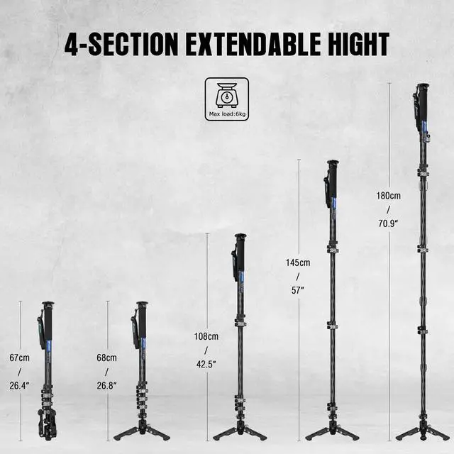 Height Adjustment: The travel camera monopod features an ergonomic buckle for effortless height adjustments, providing a working height range from 26" to 71" with its 4-section extendable leg. Upgrade your stability with the extended feet for a reliable shooting experiencePacking