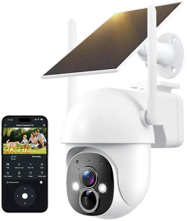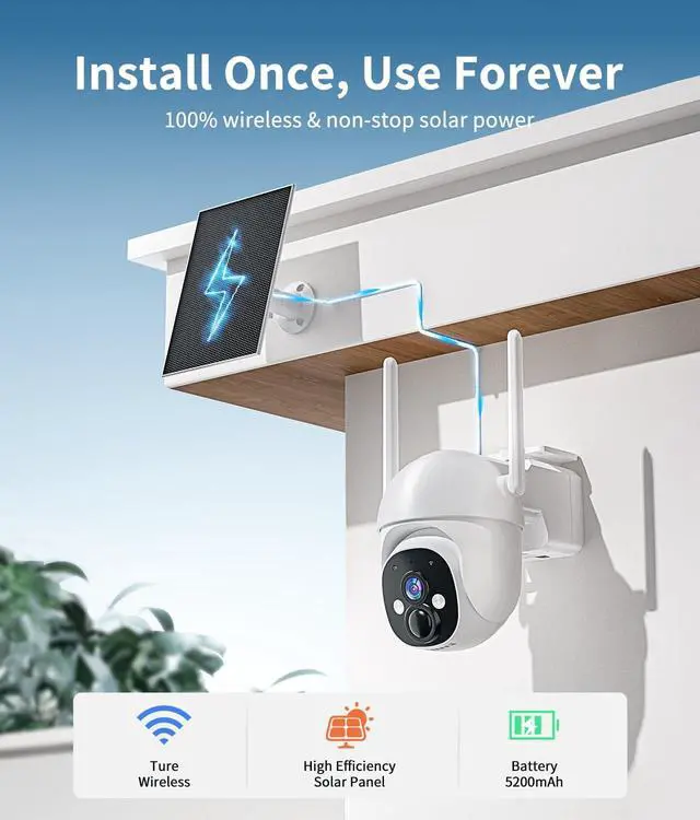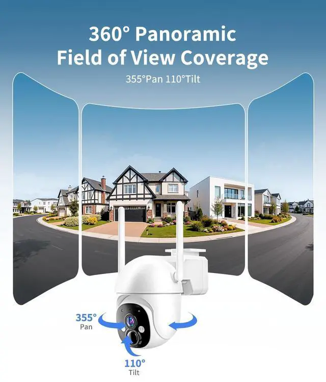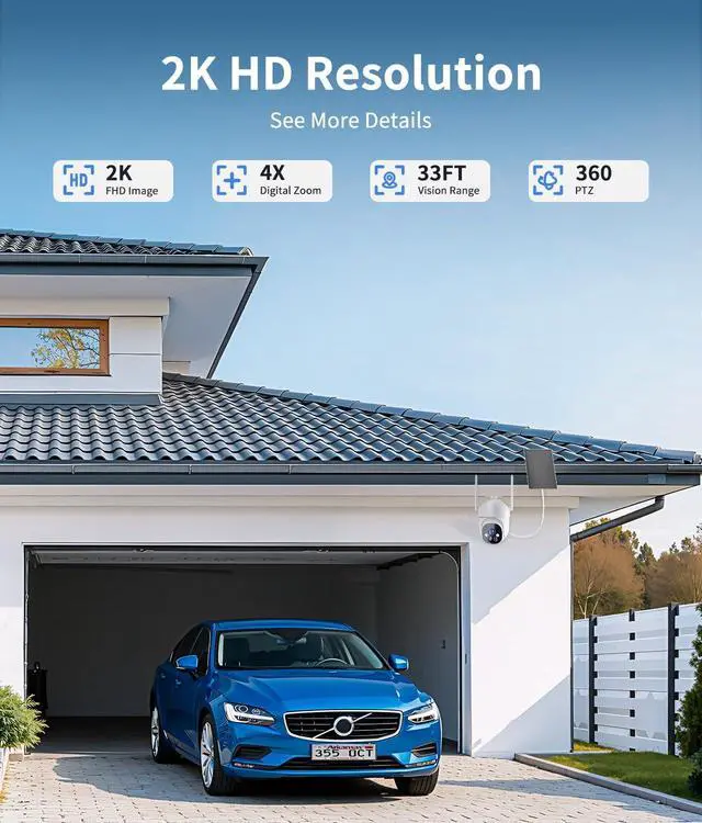 SOLAR POWERED & WIRE-FREE - The high-efficiency solar panel continuously powers the solar camera outdoor wireless, featuring a built-in rechargeable battery for uninterrupted protection, even on cloudy or rainy days. No wiring, no frequent battery replacementideal for long-term outdoor security use. ^^ 2K HD RESOLUTION & 360 PANORAMIC COVERAGE - This outdoor solar security camera wireless delivers sharp 2K video and supports 355 horizontal & 90 vertical rotation via app control, providing full 360 coverage. The camera offers an effective monitoring distance of up to 33 feet, helping detect activity clearly around your home, yard, or garage.