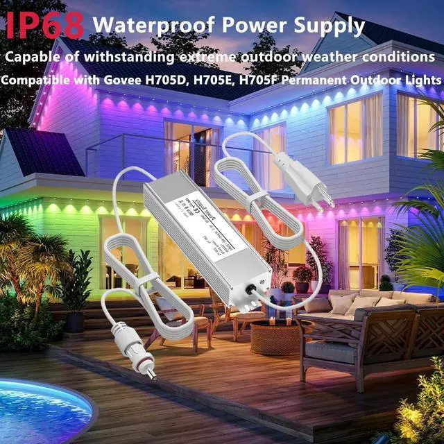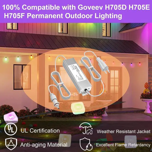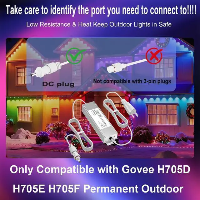 ^^ Important Notice: This charger is exclusively compatible with Govee Permanent Outdoor Lights 2nd Generation (models H705D/H705E/H705F), with each LED emitting 40 lumens. Do not cut the light string. Not compatible with Govee Permanent Outdoor Lights (H705A/H705B/H705C - 25 lumens) or Govee Permanent Outdoor Lights Pro (H706A/H706B/H706C - 60 lumens). Incompatible with all other models. Verify compatibility before purchase.