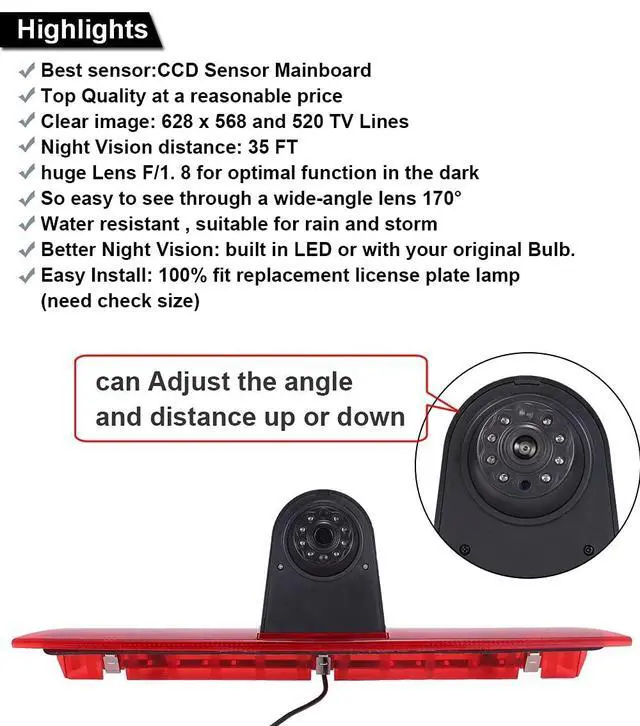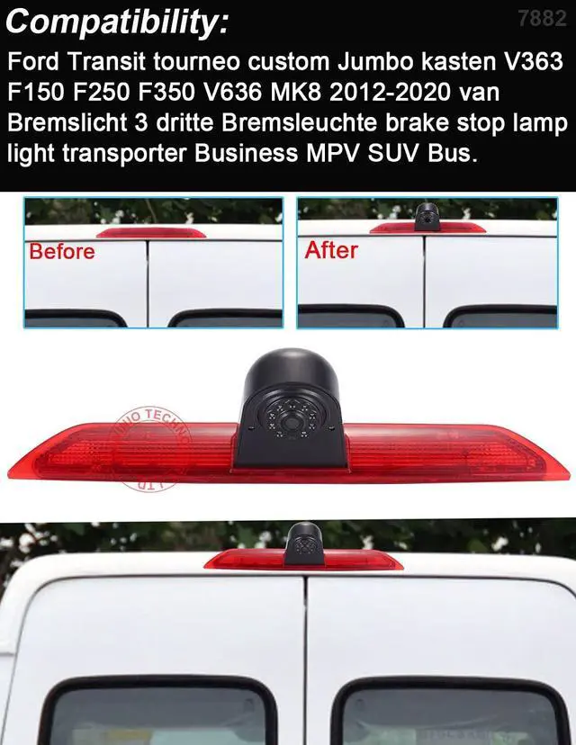 3rd Third Brake Light Rear View Backup Camera Replacement for Ford Transit tourneo custom Jumbo kasten V363 F150 F250 F350 V636 MK8 2012-2020 van ^^ 170 ultra-wide anglemore comprehensive view of the situation behind the car, directly reducing the risk of reversing, avoiding pedestrians and obstacles in the blind area ofreversing. ^^ IP67 waterproof housing with anti-fog lens. And with a glass window on the surface that is sealed to protect camera when raining or snowing, Rear View Camera can work normally in high temperature, low temperature, rainy and foggy environments, and can cope with harsh environments.
