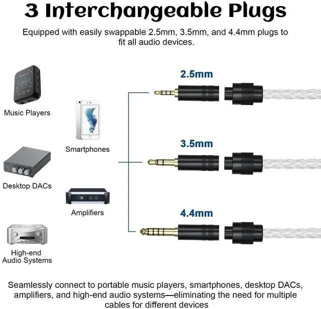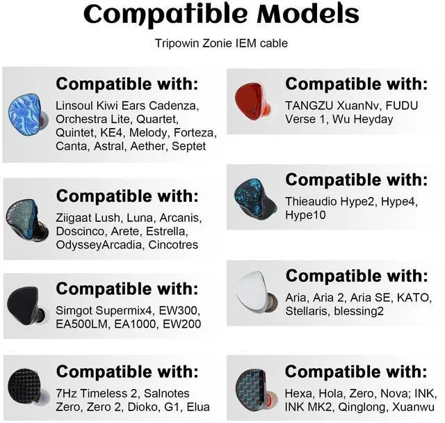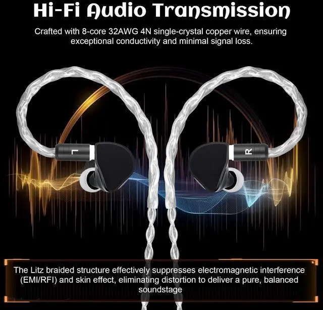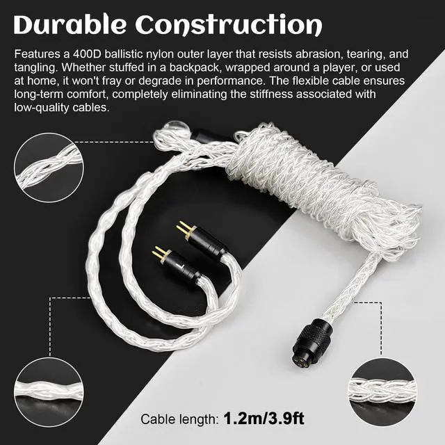 CompatibleCompatible with Kiwi Ears Cadenza, Orchestra Lite, Quartet, Quintet, KE4, Melody, Forteza, Canta, Astral, Aether, Septet; Compatible with Ziigaat Lush, Luna, Arcanis, Doscinco, Arete, Estrella, OdysseyArcadia, Cincotres; Compatible with Simgot Supermix4, EW300, EA500LM, EA1000, EW200; Compatible with 7Hz Timeless 2, Salnotes Zero, Zero: 2, Dioko, G1, Elua; Compatible with TANGZU XuanNv, FUDU Verse 1, Wu Heyday; Compatible with Thieaudio Hype2, Hype4, Hype10; Compatible with Aria, Aria 2, Aria SE, KATO, Stellaris, blessing2; Hexa, Hola, Zero, Nova; INK, INK MK2, Qinglong, Xuanwu. Gold-Plated ConnectorsGold-plated plugs and 0.78 mm 2-pin jacks feature corrosion resistance for stable signal transmission. Durable MaterialsAn eight-core structure minimizes internal cable wear for enhanced durability, while the braided design effectively prevents tangling and abrasion. Superior Shielding PerformanceEffectively blocks interference from electronic devices like smartphones and laptops, delivering a pure, noise-free listening experience. 1.2 m Golden LengthThe 1.2 m/ 3.9 ft cable length accommodates both desktop use and mobile listening needs. Portable DesignFoldable for space-saving storage and easy portabilitythe ideal companion for commuting and travel. The Perfect Choice for Audiophiles and AthletesWhether you're an everyday listener seeking sound enhancement, an audiophile optimizing your setup, or a fitness enthusiast needing secure wear during workouts, this cable delivers seamless compatibility. Wide CompatibilitySeamlessly connects to premium in-ear monitors, budget-friendly in-ear monitors, and various mid-range products.