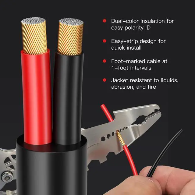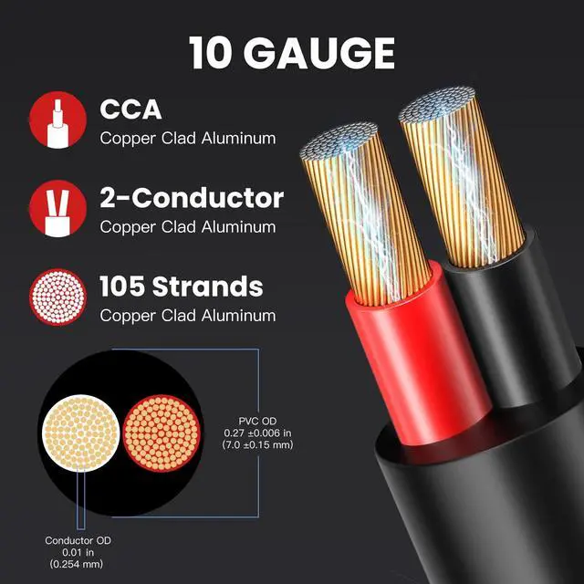 Deep Burial Performance Heavy duty PVC withstands soil moisture and pool splashes supports 24 inch burial without conduit for permanent outdoor installations ^^ Advanced UV Defense Carbon reinforced jacket provides 3 times longer lifespan resists sun damage in gardens and patios ^^ Precision 105 Strand CCA Copper clad aluminum ensures minimal signal loss with corrosion resistance for crystal clear outdoor audio ^^ Mud Proof Polarity Coding Thick red black stripes visible in dirty conditions ensures accurate connections ^^ Dual Safety Certified CL3 andcompliant materials 158 ignition point for safer burial near structures