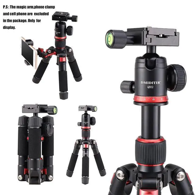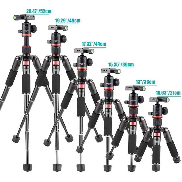 [Note] For cameras with telephoto zoom lens, you need to purchase a tripod mounting ring or telephoto lens holder to get a better balance for shooting ^^ EASY TO ADJUST AND USEOur tripod adopts an advanced eccentric-lock system, semi-automatic buckle to control the angle of the leg tube, which can quickly set and stabilize the position, and can quickly adjust three angles (85/ 55/ 23), The height ranges from 18cm/ 7.1" to 52cm/ 20.47", and it contains multiple anodized surface treatments. It feels very smooth and durable, which can almost meet the needs of most people in different scenarios ^^ 360METAL BALL HEAD & PTZOur tripod uses a high-quality 28mm ball head for pan/tilt shooting.