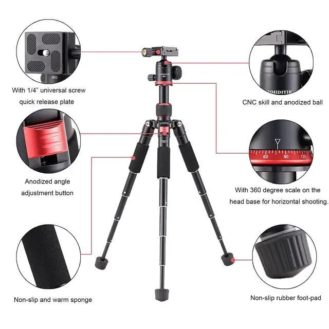 STURDY AND STABLE STRUCTUREThe tripod kit is made of thick aluminum tube, traditional eccentric tube lock and non-slip rubber feet. The ball head has a diameter of 22mm and is made of aluminum alloy to provide a high level of stability. It can withstand a weight of from 5 to 13.23 pounds (6 kg), which increases the overall safety and stability of the ball head. It is suitable for various of cameras ^^ APPROPRIATE COMPATIBILITYThe aluminum tripod is compatible with all cameras and equipment, such as SLR cameras, sports cameras and mirrorless cameras, and can also be used with mobile phones and projectors.