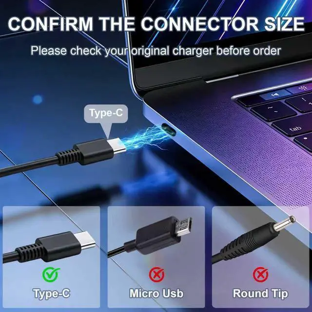Connector Size: Type USB C tip. ^^ CompatibilityCompatible with Surface Pro 12 (2025), Surface Pro 11, Surface Pro 10, Surface Pro 9, Surface Pro 8, Surface Pro X, Surface Pro 7+, Surface Pro 7. ^^ CompatibilityComaptible with Microsoft Surface Pro 2-in-1 Laptop/Tablet (2024). ^^ Safety and ProtectionAn advanced protection system guards against over-current, over-voltage, overheating, and short-circuitsso you can charge with confidence. ^^ Packaging Includes1 x 65W USB C Charger, 1 x Power Cord.