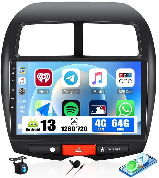 Android 13 Car Stereo for Mitsubishi Outlander Sport ASXThe carplay car stereo fits for Mitsubishi Outlander Sport 2011-2017/ASX 2013-2015/RVR 2011-2017. Android 13 system, 10.1 '' Capacitive touch screen, screen size is 228mm*218mm*130mm, 4G RAM+64G ROM, running smoothly in colleges and universities. A variety of EQ sound effects scene selection. Capacitive touch screen, 1280*720 high resolution, Support 1080p video, will provide you the Excellent experience in the car ^^ Compatible with Wireless Carplay&Android Auto&Mirror LinkThis car stereo supports CarPlay/Android Auto function. Just connect Bluetooth, you can project the contents of your phone to the large screen of the host, and you can share your favorite 1080P videos, high-definition pictures, etc.