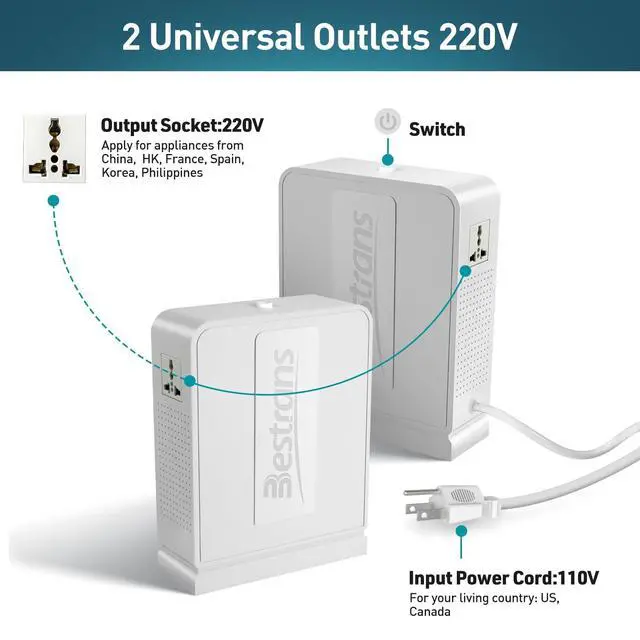 ^^ Dual Outlet Convenience: Plug two 220V devices into this converter 110 to 220 volt simultaneously via universal outlets. Always verify the total wattage of your appliances to stay within the converter's capacity limit.