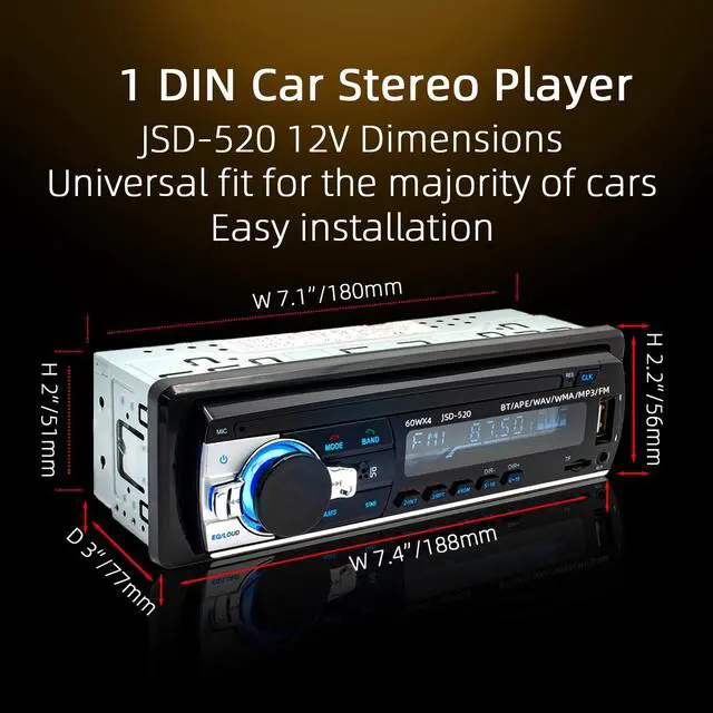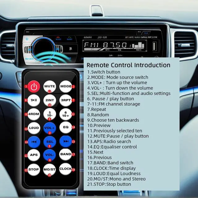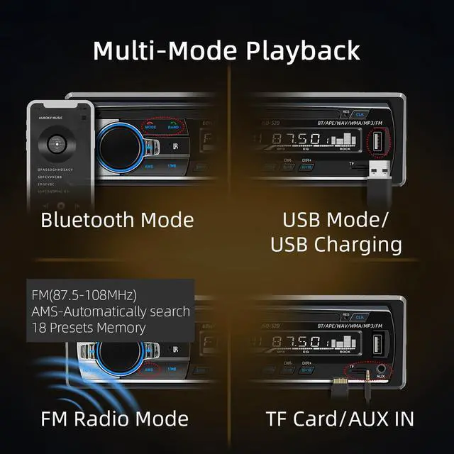 Note: Operates on 12V power onlynot compatible with 24V. ^^ Bluetooth SupportPair your smartphone effortlessly via Bluetooth for stable, play songs and audiobooks directly, compatible with various playback applications. The car audio equipped with a remote control, it is convenient for hands-free calls, allowing you to focus on driving. ^^ FM RadioTune in to your favorite stations with the built-in stereo FM Radio Receiver, automatically scanning 87.5 -108MHz FM bands. Save presets for quick access to news, music, sports, and more, turning every drive into an entertaining journey. ^^ Multi-Mode PlaybackThe car radio supports USB Charging/AUX In/TF Card mode to play audio. The built-in Equalizer (EQ) allows adjusting sound parameters to match your preferred music style, ensuring immersive listening experience. ^^ Satisfied ServiceIf you have any product quality damage, installation or other problems, you can contact us at any time and will give you a effective solutions.