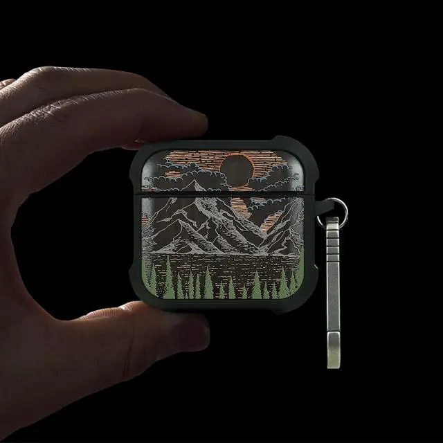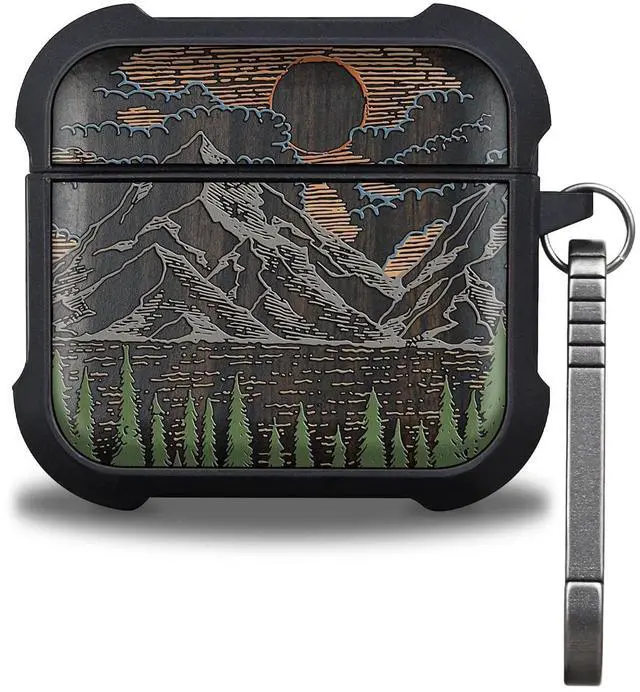 Patterit for AirPods 4 Case (2024) (USB-C), Shockproof Cover with Quick Released Keychain, Compatible with AirPods 4th Generation, Natural Wood Hand-Drawn (Mountain Dawn) Dark Wood