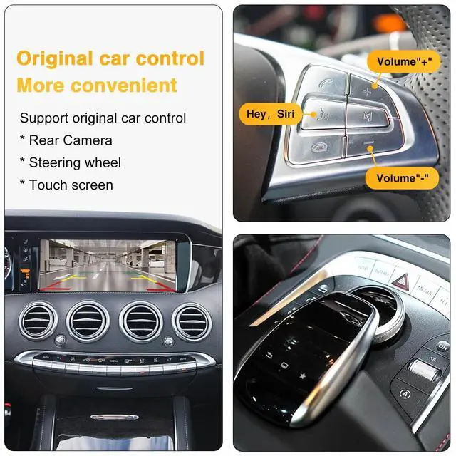 Support Waze and sygic map, etc, listen to your favorite songs using iTunes, Apple Music or other apps and access to messages. Support fatory original reverse camera, parking radar, aftermarket reverse camera and 360 camera; Support front view camera DVR (CVBS input). ^^ Support Steering Wheel Buttons and Car Knob ControlSupport the Siri button, telephone button, and voice + - buttons on the steering wheel, but other buttons on the steering wheel are not supported. You can switch between the NTG system and our Carplay system using the car knob, which is more convenient while driving.