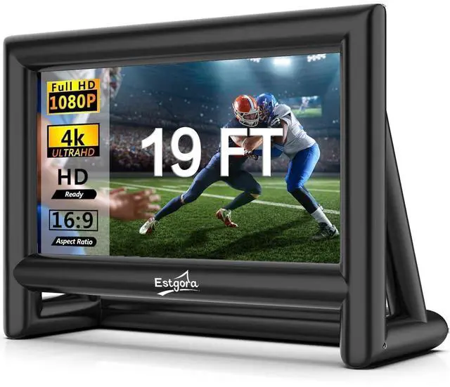black frame size: 14ft x 11.5 ft with a 16:9 aspect ratio. Estgora inflatable projector screen has a wide 160 viewing angle and is positioned high enough to provide a great viewing experience for everyone. ^^ PORTABLE MOVIE THEATEREstgora large blow up projector screen is ideal companion for your celebrations. You can host family gatherings, movie nights, birthday parties and more in your backyard or by the pool. And also hold party entertainment, watch ball games, music festivals and other events at the park or beach. The big screen adds fun and excitement to your event, giving the attending partners a more unique experience and atmosphere. ^^ EASY SETUPEstgora outdoor projector screen is very easy to install and store.