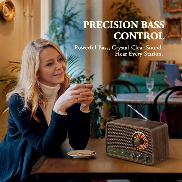 POWERFUL BOOMSOUND& BASS CONTROL: Enjoy exceptional sound quality from a 10-Watt full-range speaker featuring an enlarged magnet and deep bass compensation, all housed within an acoustically tuned cabinet for warm, clear, and immersive audio. ^^ AM FM RADIO WITH EXCELLENT RECEPTION Covers FM (87-108 MHz) AM(520-1710KHz). Configured with a long telescopic antenna and a DSP chip, this vintage radio bluetooth speaker have more excellent ability to pick up more stations, whether you live in the city or countryside. Youll get a lot of fun and useful information from talk shows, current affairs, weather broadcasts, ball games, etc. ^^ RETRO BLUETOOTH 5.0 SPEAKER WITH AUX INPUTMore than just a retro radio, it's a versatile retro Bluetooth speaker featuring Bluetooth 5.0 and Aux input. A dependable 5.0 Bluetooth technology allows you to stream your music from your phone to the radio speaker.. Auxiliary Input for Additional Audio Sources Like MP3 Player or iPod/iPhone. ^^ VINTAGE WALL-PLUG RADIO ^^ EASY TO USE Real wood grain presents a vintage vibe, making the vintage radio an indispensable anthropologie home /office decor. The tuning knobs are much more intuitive, even the elderly can easy to figure it out.