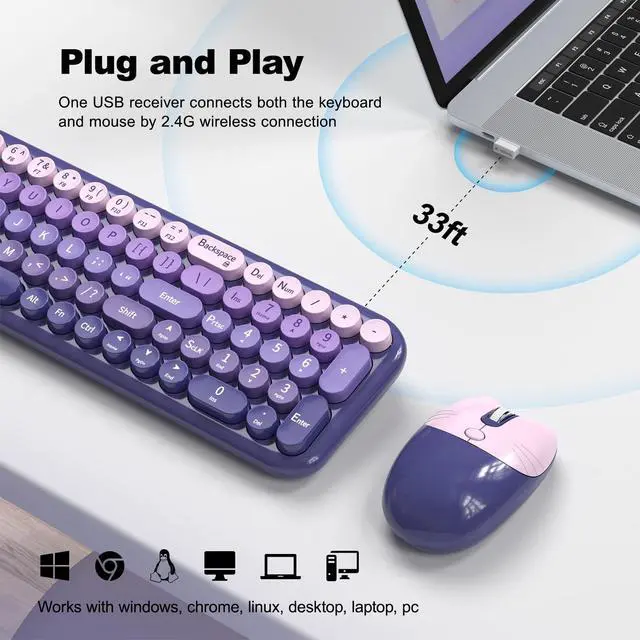 Wide Device Compatibility: The wireless keyboard and mouse combo include a retro keyboard and a cute cat shape mouse. Works with your PC, desktop computer, laptop, or notebook. Compatible with Windows XP / Vista / 7 / 8 /10 operating systems ^^