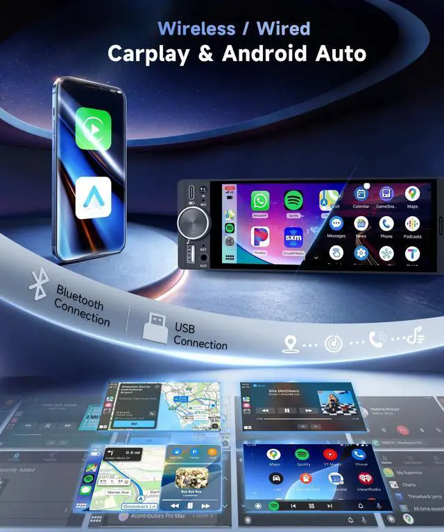 6.28 Inch HD Touchscreen & Universal 1DIN SizeThis single din car stereo is equipped with a 6.28 inch high-definition touchscreen that provides clear and stable image display for daily navigation and media playback. It adopts a standard 1DIN size that fits most cars, trucks and SUVs with 1DIN dashboard openings without extra modification. Built-in USB and Type-C ports support fast charging for mobile devices and external multimedia connection, bringing convenience to your daily driving experience. ^^ Wireless & Wired CarPlay & Android AutoThis car audio receiver supports both wireless and wired connection for CarPlay and Android Auto.