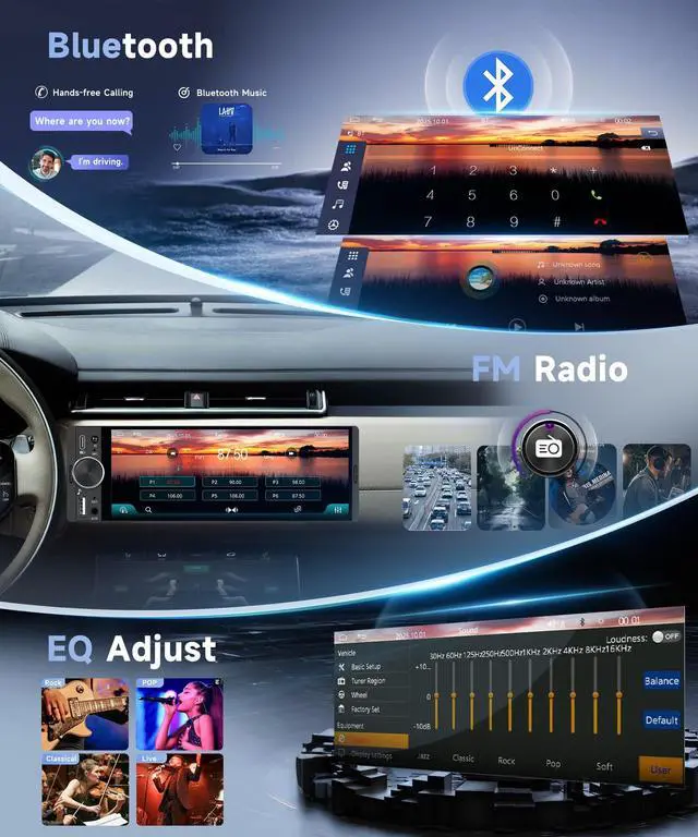 After stable connection, you can access navigation, music, contacts and other commonly used functions directly on the large screen. The voice control function allows you to operate the device without using your hands, helping you stay focused on driving and improve safety during daily commutes and long-distance trips. ^^ Bluetooth Hands-Free & Complete Multimedia FunctionsBuilt-in Bluetooth brings stable hands-free calling and wireless music streaming, effectively reducing distractions while driving. This car radio supports FM radio with multiple preset stations and customizable EQ audio settings to meet different sound preferences. It also supports mirror link function for Android and iOS devices, allowing you to cast phone content to the large screen for a better entertainment experience.