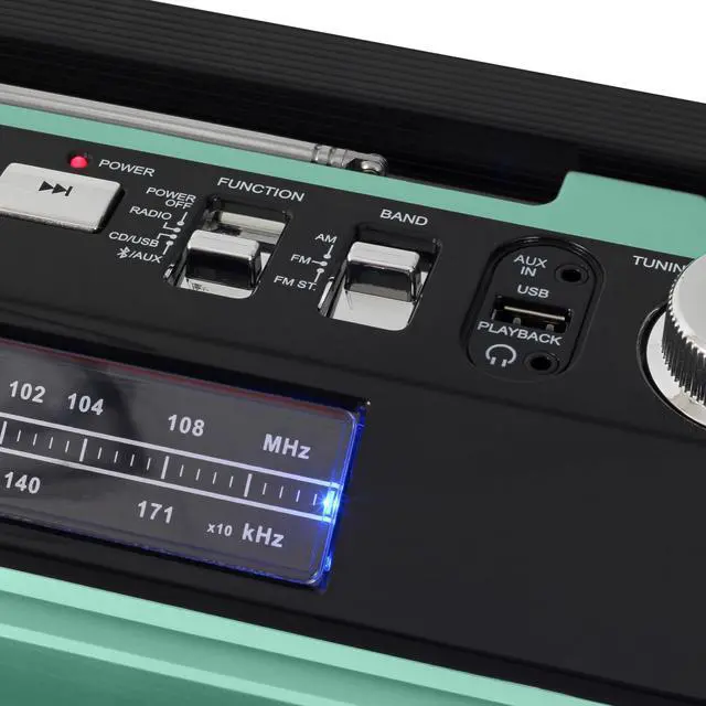 This retro portable boombox combines classic style with modern functionality. It features an AM/FM analog radio and Bluetooth connectivity for streaming music. The front-loading CD player is compatible with CD, CD-R/RW, and CD-MP3 formats. Additionally, a USB MP3 playback port allows you to play music directly from a flash drive. The multi-color LED equalizer adds a dynamic visual element to this stylish unit. It includes an auxiliary input jack and a headphone jack for versatile listening options. Other notable features are the built-in stereo speakers, rotary volume control, treble and bass adjustments, and a convenient carrying handle.