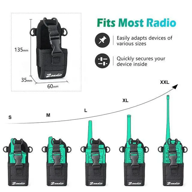 Weight: 75g- Carrying/Belt/Neck, 3 in 1 design- Adjustable Inside Dimensions to hold small devices like hand-held radios, Phone and GPSUniversal compatible pouch, designed for most brands of walkie talkie. Compatibility with Motorola, Kenwood, Midland, Yaesu, Icom and other two-way radios.