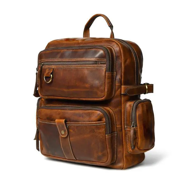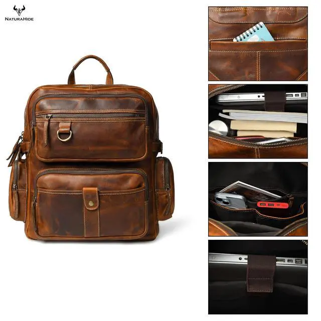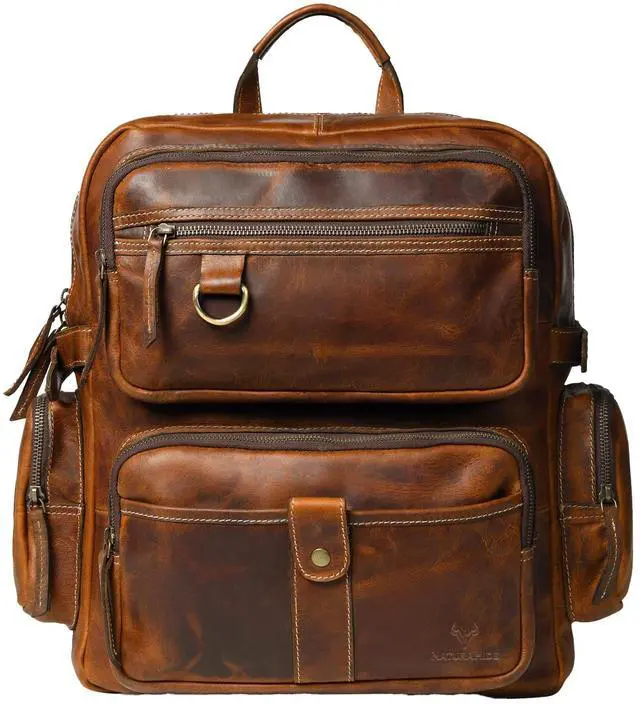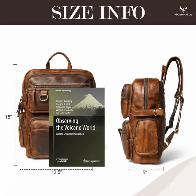 Premium Full Grain Leather Crafted from rustic tan cowhide leather that ages beautifully with use. ^^ Strong & Durable Hardware Brass buckles, brass zipper, and reinforced wax-thread stitching for reliability. ^^ Smart Storage Design Features 5 pockets, 2 compartments, and 15L capacity to organize daily essentials. ^^ Comfortable Carry Equipped with sturdy cowhide leather straps and cotton poly drill inner lining. ^^ Versatile Use Ideal leather rucksack for work, college, travel, or casual outings; unisex design for men & women.
