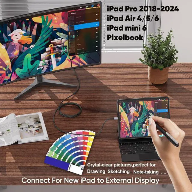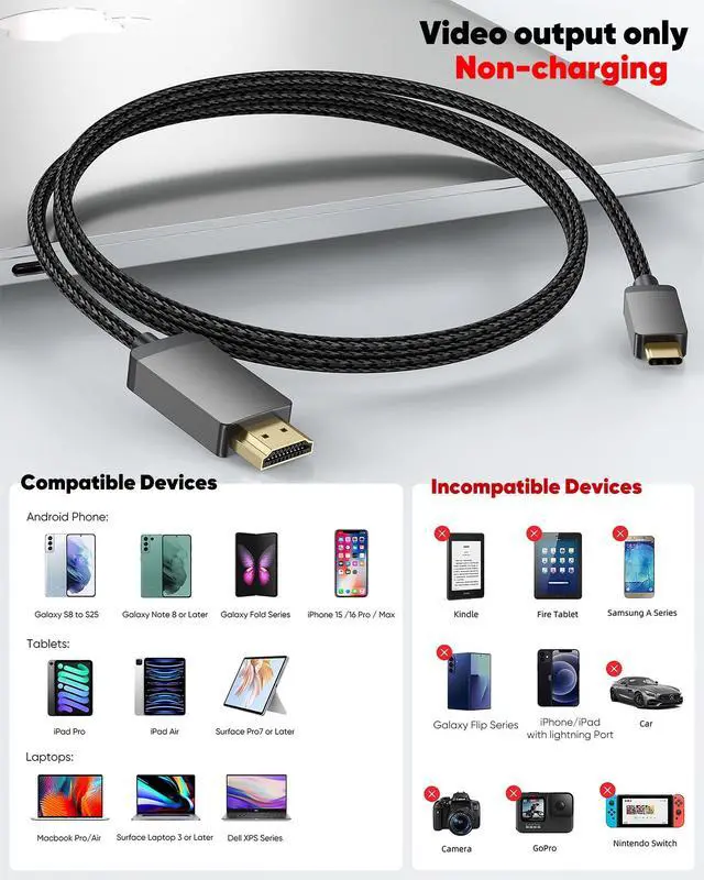 Wide CompatibilityThe Thunderbolt 3 to HDMI cable is compatible with iPhone 17 16 15 Pro/Max, Apple MacBook Pro/Air M1, MacBook Pro 2016 or later, MacBook Air 2018 or later, iPad Pro 2018 or later, iPad Air 2020-2024, XPS 17/15/13, Surface Book 3/2, Surface Laptop 4/3, Surface Pro 7, Samsung Tablet S9/S8/S7, Galaxy S23/S22/S21/S20/S22/S23/S25/S26/W25/Z.(more compatible devices see description)