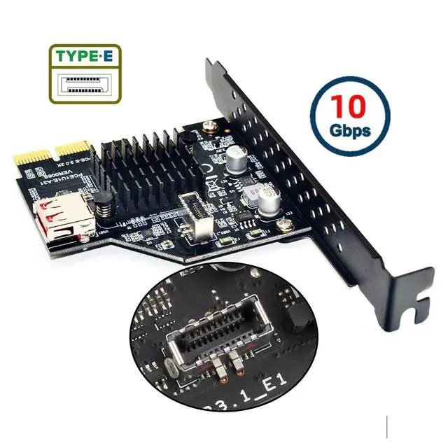 Connector-2: USB 3.1 Front Panel Header ^^ 2) The Type-E port supports 10Gbps USB Data from SSD/HDD. Doesn't support any audio, video and docking output, Not work for any PD power, DP alt mode. ^^ 3) The adapter is a converter to convert the available PCI-E of a motherboard into a USB 3.1 header.; Thus the USB 3.1 port of a housing can also be supplied with USB 3.1 without a suitable mainboard. ^^ 4) The compact adapter can be inserted directly and requires no additional attachments.; Converter plug-in for the mainboard; Fits into any USB 3.0 header; Bundling in USB 3.1 with up to 10 GBit / s ^^ 5) Converter plug-in for the mainboard, Fits into any USB 3.1 header, Bundling in USB 3.1 with up to 10GBit/s, The adapter not support video, audio and PD power.