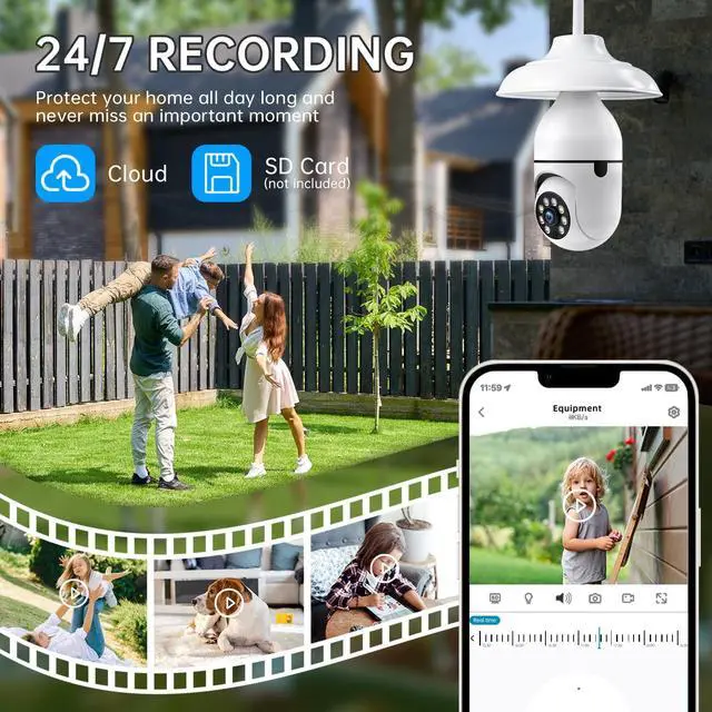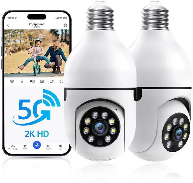 Note: Compatible with both 5GHz and 2.4GH z dual-band WiFi routers. ^^ 3MP Color Night Vision & Multiple Devices Sharing- 2K Full HD bulb security camera provides crystal clear videos and recordings. Quality infrared LEDs & Sensor extend the range of night vision reach up to 66ft, lets you see everything clearly even in the dark. You can share your cameras with family, friends and other devices so that you can all access them simultaneously. Compatible with Alexa free up your hands. ^^ Motion Detection & Motion-Tracking AlertsBuilt-in precision sensor, motion tracking supports security cameras to accurately detect objects and automatically track them in a super large range of 355 pan and 90 titl within 30 feet. You can also set a fixed monitoring point and adjust to this position at any time. The home security cameras will begin to automatically record and follow the object in motion, and "Alarm" when needed. ^^ Outdoor & Indoor Use- IP65-rated weatherproof design makes it ideal for use in any environment, indoor or outdoor. Whether installed in porches, back doors, garages, gardens, warehouses or roof overhangs - our 5G 2.4G wifi security camera provides 24/7, year-round protection for your property and family.