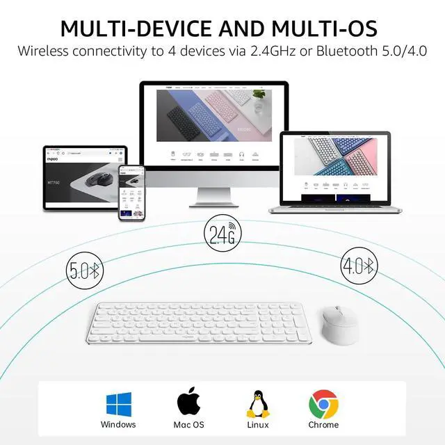 Compact Wireless ComboFeaturing a 99-key layout with number pad and arrow keys, a silent mouse with side buttons - enhancing your typing and browsing efficiency yet taking 20% less space. ^^ Multi-Device and Multi-OSPair with up to 4 devices on nearly any operating system (Windows, Mac OS, Linux) via Bluetooth 5.0 / 4.0 and the plug-and-play USB receiver. Open up new ways to type on your PC, tablet, phone, or a second computer. ^^ Fluid Typing ExperienceLaptop-like profile with incurve rounded keys for your fingertips delivers a fast, fluid, precise and quiet typing experience.