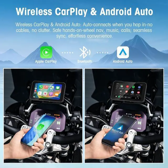 Voice Control: Wireless car play para moto features CarPlay and Android Auto. Connect your smartphone wirelessly to motorcycle radio via Bluetooth and simply access to the phones Apps, phone calls, navigation, video and music. You can take control of your ride with built-in voice control powered by Siri and Google Assistant, android auto for motorcycle making your driving safety and convenience ^^ Built-in