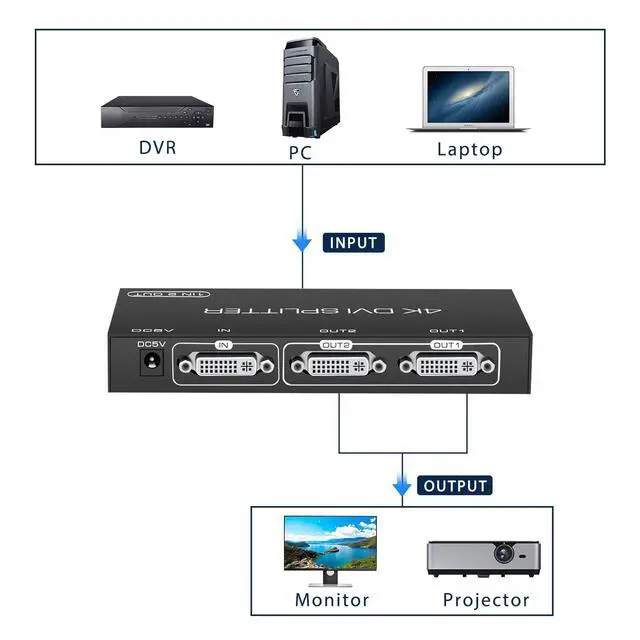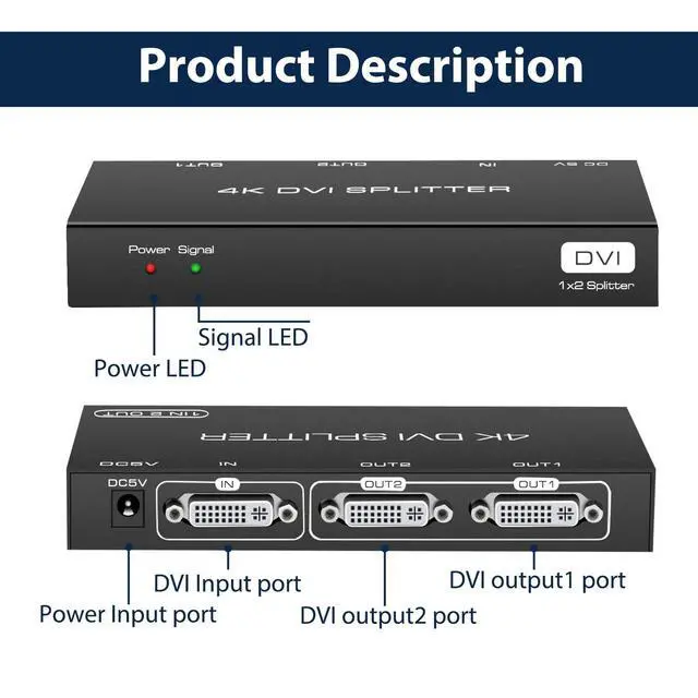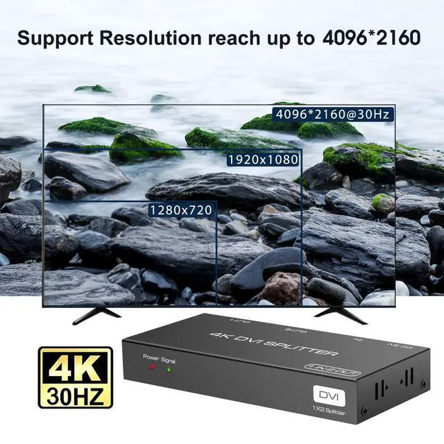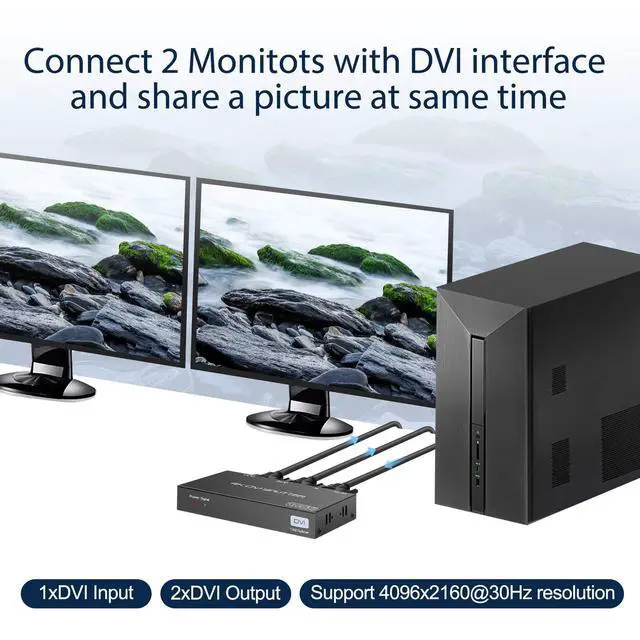 (Note: it does not support displaying one monitor in dulite desktop mode and another in extended desktop mode) ^^ EDID Copy SystemOutput 1 port is the copied port, to make sure the better compatibility of the splitter, please connect the lower resolution monitor with the output 1 port ^^ High ResolutionSupport DVI signal resolution up to 4096x2160@30Hz, Also supports non-standard DVI resolution transmission, such as 2000x1000@60Hz etc. No damage to image content, no coding and decoding of DVI signal, lossless transmission to assure that you enjoy clear pictures ^^ Remote signal transmissionThe DVI splitter is project level signal enhancement and amplification. It can realize transmission distance of 10 meters in front and back, 20 meters long-distance lossless transmission in total ^^ Easy to UsePlug and play, operating system independent, no software or driver required