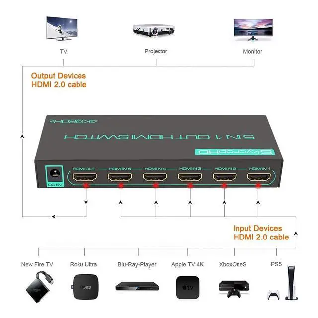 Add More HDMI Ports to Your TVThis new version of SkycropHD 4K HDMI Switch uses the latest HDMI chipset to ensure more stable performance. It expands TV HDMI port quantity to 5 plus and saves your hassle of plugging and unplugging cables ^^ True 4K Ultra HDSkycropHD HDMI Switch supports 4Kx2K (40962160) up to 60fps with 8bit