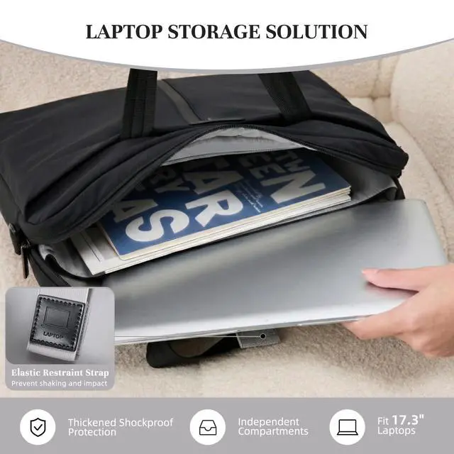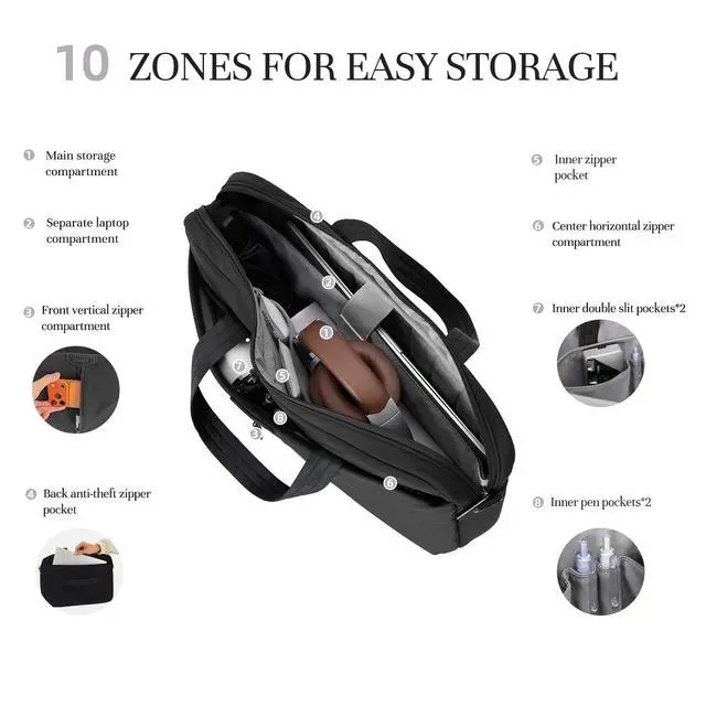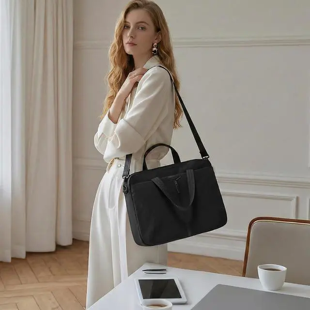 3-IN-1 VERSATILE LAPTOP Briefcase 16.14"L 11.61"H 2.17"W. Ultra lightweight design, weighing only 1.47 lbs. Featuring an innovative detachable wide shoulder strap, this bag can be easily switched between hand-carry, elegant underarm, and casual crossbody modes. It seamlessly adapts to various occasions like office work, travel, and daily outings, transitioning effortlessly from professional to casual settings. Its airline-friendly size meets most carry-on requirements. ^^ ULTIMATE LAPTOP PROTECTIONThe separate laptop compartment features triple protective layersdelivering 360 all-around superior protection. The outer layer employs water-resistant nylon (3-4 rating) as a splash-proof Oxford fabric surface.
