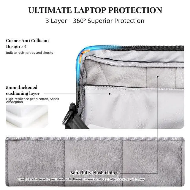 The middle layer utilizes 5mm high-resilience pearl cotton as a thickened shock-absorbing cushion. The innermost layer uses soft, plush fleece as a liningskin-friendly and scratch-resistantwith three-dimensional vertical embroidered stitching. ^^ LAPTOP STORAGE SOLUTIONThe independent laptop compartment specifically designed to fit a 17.3" inch and features elastic restraint strap to prevent shaking and impact. The elastic band incorporates voltage technology, featuring a two-layer genuine leather label printed with the laptop logo pattern, emphasizing its professional laptop storage functionality. It also offers additional storage space and an internal zippered pocket, providing ample room for documents, books, or tablet.