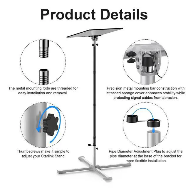 ^^ [Pipe-insert assembly design]: This Starlink pole mount for gen 3 features adjustable height up to approximately 1.2 meters, allowing for easier installation and removal without traditional screw fixation. It includes three assembly pipes and is perfectly suited for Starlink Gen 3 satellite signal receivers.