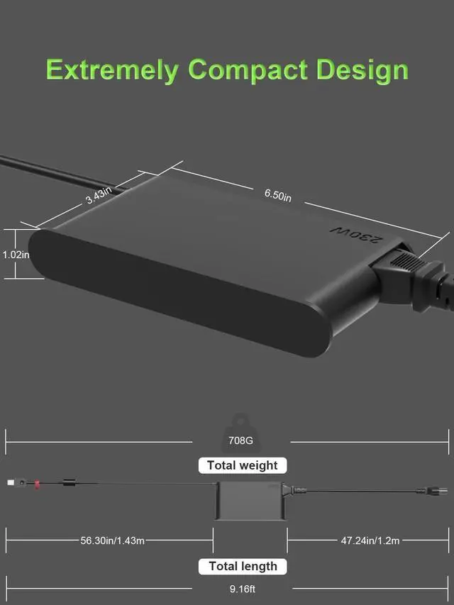 Its wide input voltage range of 100-240 volts allows for seamless operation in any country. With a total length of 2.7 meters ( 8.85 feet), it comes with a 1.5 -meter adapter cord and a 1.2 -meter detachable power cord, allowing you to enjoy a flexible and convenient user experience. ^^ Complete Set with 12-Month Worry-Free GuaranteeThe set includes one 230W power adapter and one detachable power cord. We also offer a 12-month warranty and a 30-day no-questions-asked return policy. We are committed to providing high-quality power solutions and timely customer support. If you have any questions about compatibility or specifications, our team is happy to assist you, ensuring a worry-free shopping experience from the start.