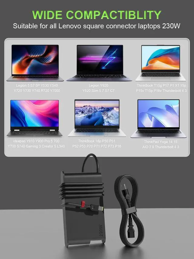 CompatibilityThis 230W power adapter is fully compatible with Lenovo's mainstream product lines, including Lenovo Pro 5 (Y545 Y740 Y720), Legion/Slim 5 7 (17ITH6 17ITH6H 16AHP9 16APH8), and Thinkpad/Thinkbook/ThinkStation more series. It is also compatible with Lenovo laptops equipped with 135W and 170W power supplies.