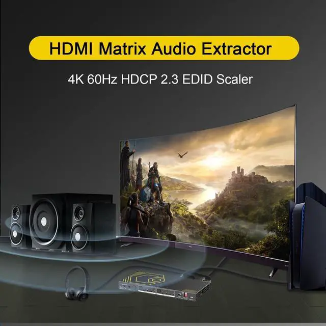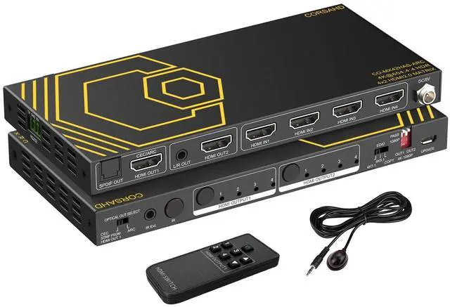 4x2 HDMI Matrix 4K 60Hz SPDIF TOSLINK---4K HDMI Matrix 4 in 2 out is designed to switch between four HDMI sources to two displays. The two output signals can be different or the same. converts it to Optical S/PDIF or high-quality stereo 3.5 mm audio output. Comes with EDID management, Down scaler function, IR remote, panel control; IR Extension cable; RS232. ^^ UHD Lossless Audio Video Formats -- Video Format - 4K@60Hz, 1080p@120Hz/60Hz 3D, 3840x2160@60Hz, 1440p@60Hz, HDR, D-olby Version, HDCP 2.2, HDCP 2.3 bypass, IMAX DIGITAL(2K/4K), 4:4: 4 8bit - Audio Format - Supports ARC, Dolby Atmos, Digital 7.1CH, DTS: X, Dolby True HD, DTS-HD Master Audio. Soundbar supported.