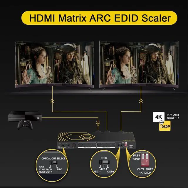 ^^ Easy Usage: Plug and play. Power on with 5V/2A. Supports 4K&1080P TV work in syncSimply connect HDMI source with Input port & HDMI receive device with Output port through HDMI 2.0 cable less than 3m, the led light will indicate which port is working. Easily switch between 4 HDMI sources by pressing the panel button. HDMI OUTPUT1 support SPDIF CEC -ARC ^^ HDMI Down-Scaler USAGEHDMI matrix switcher two outputs down-scale 4K/ HDR 10 to 1080p60Hz only. Set down-scale OUT 1 2 to 1080p separately>>NOT down-scale 4K