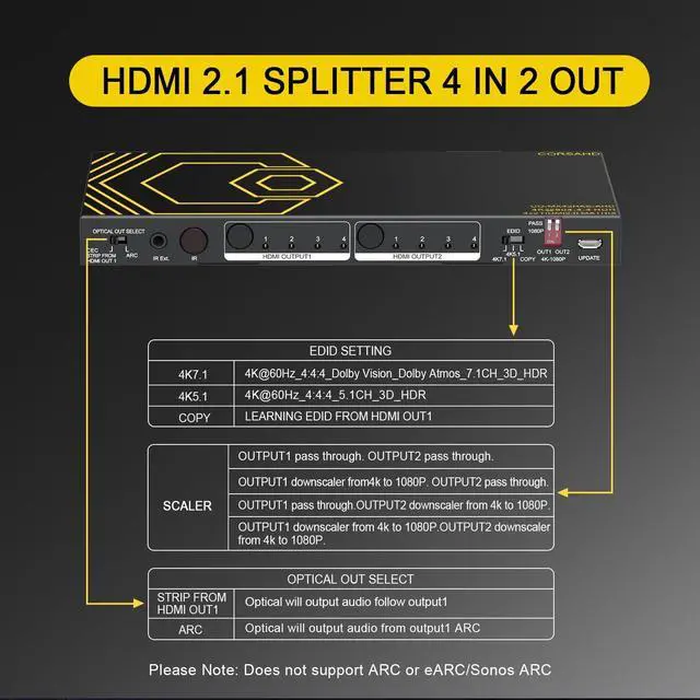 HDR D-olby Vision (4K60Hz 4:2: 2), VRR, otherwise screen wash out >> Pls read EDID DIP Switch picture, HDMI OUTPUT1 support CEC ARC (OPTICAL OUT SELECT) MUST SET TO CEC/STRIP FROM HDMI OUT1)Optical out support ARC (OPTICAL OUT SELECT MUST SET TOARC) ^^ Please NOTE -- Does NOT support e-ARC/Sonos ARC, VRR, 4K@120Hz, Upscale. If you have any questions or concerns about our products, please contact us directly through the order number.. HDMI Matrix does NOT extend screen, only duplicate/copy/mirror. EDID pass through only, does not create.