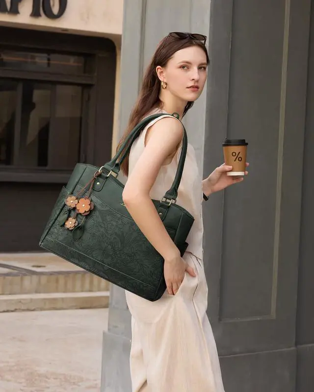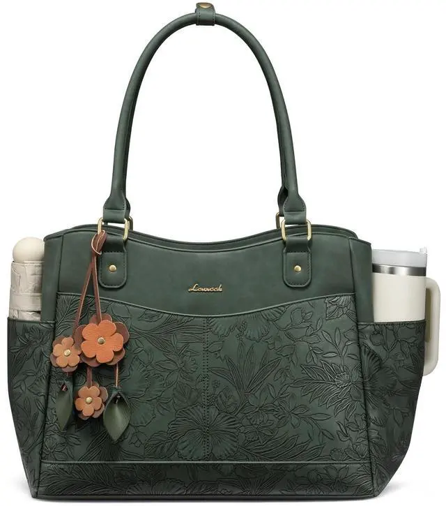 LOVEVOOK Laptop Bag for Women, 15.6inch Original Vintage Work Tote Bag Computer Office Teacher Bag with Large Cup Holder,Embossed Green