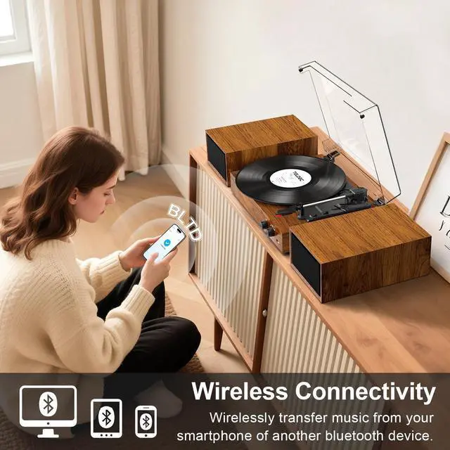 Preserve the warmth of your records while making them portable and ready for modern devices, all with a simple plug-and-play setup. ^^ WIRELESS MUSIC STREAMING INPUT Built-in with Bluetooth receiver, stream your favorite music wirelessly to the turntable from your phone or other Bluetooth device. Through the fast Bluetooth pairing and connection with the turntable, you can enjoy the premium sound from the dual external speakers. ^^ VINTAGE LOOKING DESIGNTurntable with speakers is simplistic yet elegant, it features a vintage aesthetic, adding a touch of retro vibe to any room. Two bookshelf speakers not only works as capable music station but offers multiple placement options as turntable base or record shelf.