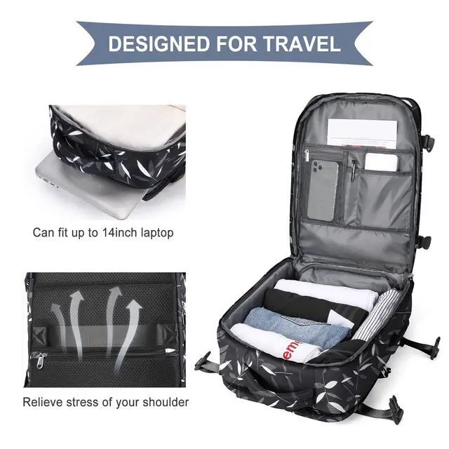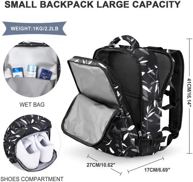 Great travel backpack for women This backpack is made of durable waterproof polyester, good air permeability and heat dissipation with two padded shoulder straps, offers lightweight carrying and strength reinforcement, relieve shoulder pressure, and maintain cool when wearing for a long time. And it's hard, solid, and doesn't fade. ^^ Separate Shoe Compartment Design & Wet Bag Main pocket x 2, laptop compartment x 2 (suitable for 13 "tablet and 14" laptop respectively), The wet bag is made of high density water resistant material can help you to separate dry items and wet items, if you have wet clothes or towel, you can put it in the wet bag.